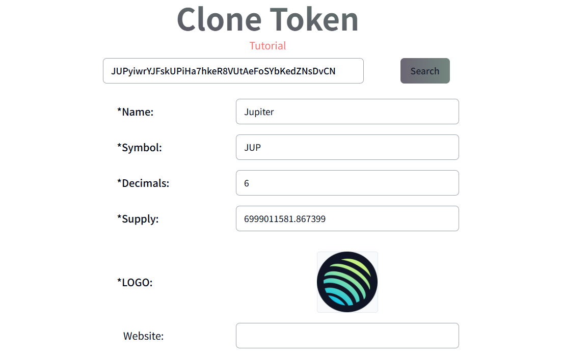 Next, enter the token’s contract (mint) address. Input the address of the token you want to clone. For example, to clone JUP, enter JUP’s contract address:\