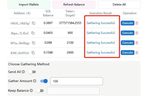 * **Gather Amount:** Customize the amount of tokens to consolidate. Wallets with insufficient balances will be skipped.
