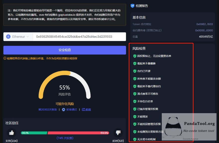 标准代币:没有任何功能/税率/权限,就是一个纯粹的代币,风险检测全绿(教程:标准代币 | PandaTool一键发币)