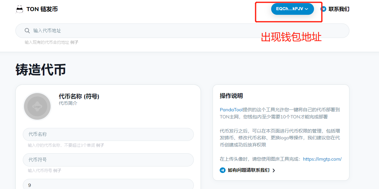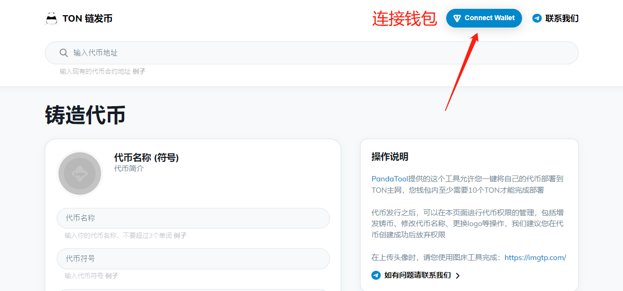 首先,我们打开TON链发币链接:https://ton.pandatool.org/,点击右上角“Connect Wallet”