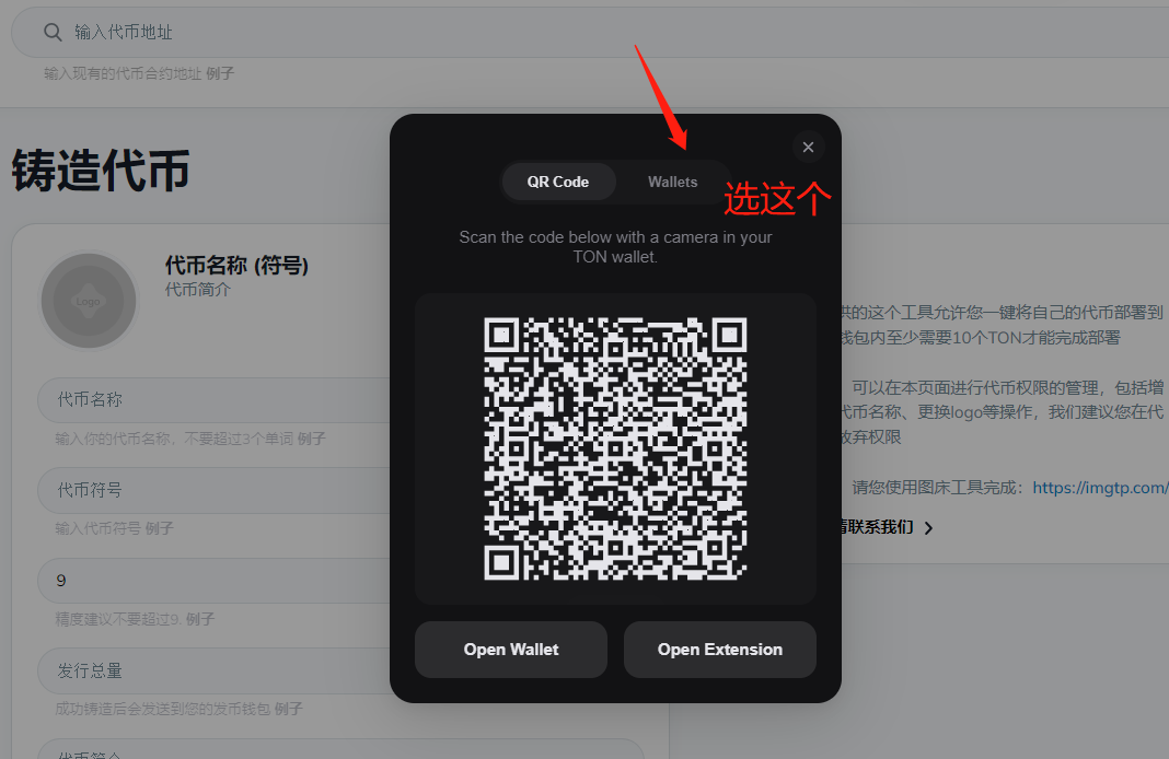 在弹出来的页面选择Wallets(不要用那个扫码登陆,扫描连接的钱包无法操作发币)