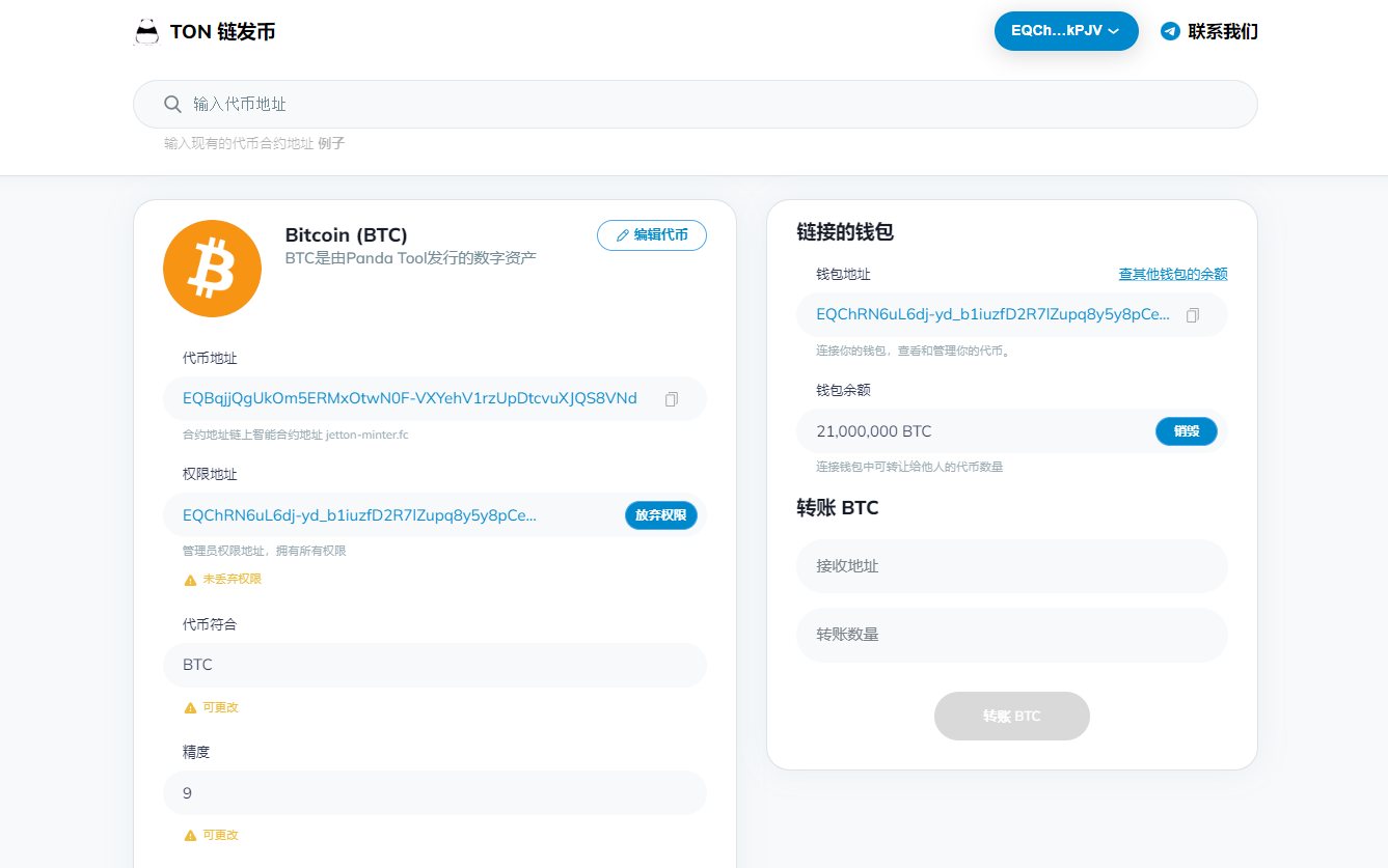 答:你可以使用其他钱包发行代币,但是管理代币权限、修改代币参数,只能使用Tonkeeper钱包