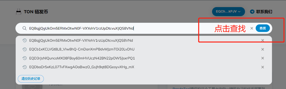 首先,我们在发币页面的搜索框,输入你的代币合约地址,然后点击查找