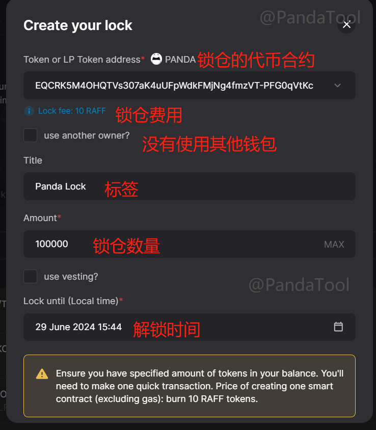 我填写的信息意思是这样的：我打算把手中一个叫PANDA的币锁10万个，大概锁到2024年6月29日解锁。