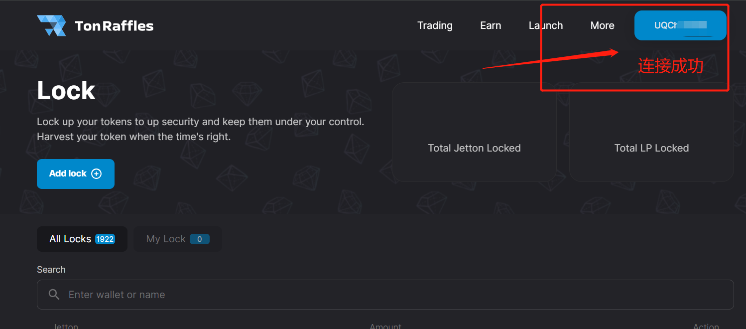 我们打开Tonraffles的官网：<https://tonraffles.app/lock> ，点击右上角Connect Wallet进行钱包连接